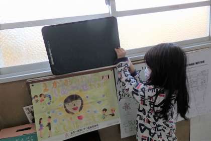 中央階段のホワイトボードのメッセージ。今週は1年生がたくさん書いてくれました。来週の始めも,1年生の応援メッセージが書いてあります。