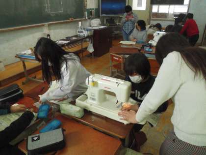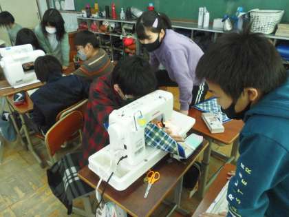 ミシンの学習では,グループに分かれて協力し合って活動しています。みんなミシンに慣れてきて,どんどんうまくなっています。