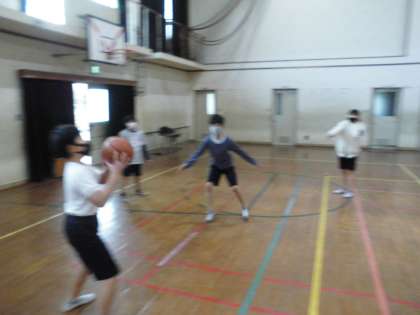 バスケットボールの学習では,ボールになれることから始めています。ドリブルやパスの基本から学ぶことができています。