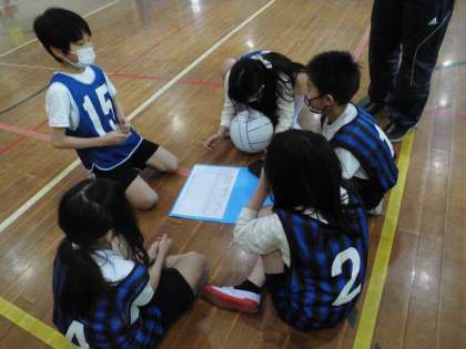 消毒の徹底,マスク着用をして,各チームで上達するための話し合い活動をしています。どのグループも真剣です。