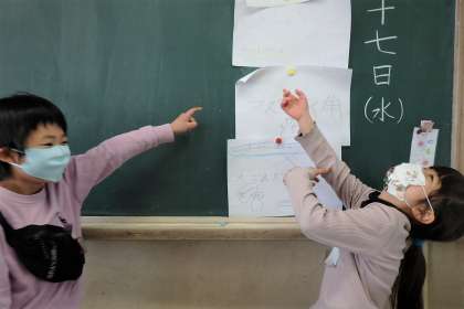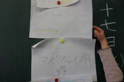 なんと,1年生です!「大ごえを出すのはやめましょう。」「もくしょく!」と,友だちに呼びかけるポスターを作りました。係活動の一環のようです。素敵な取り組みですね。