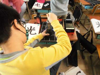 縦書き,横書き,はらい,曲がり,はね。これまでの学習を全て含んだ「光」の字を書きました。