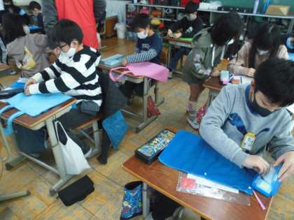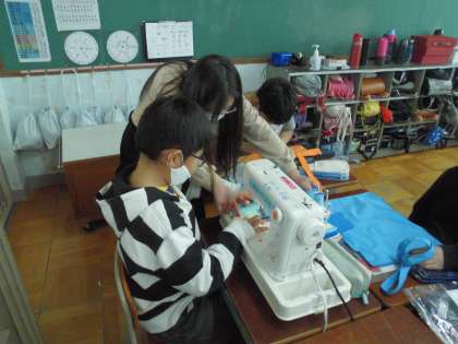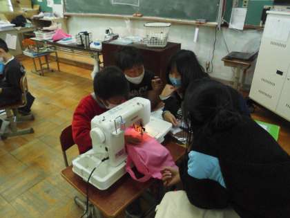 ミシンの学習でいよいよエコバックづくりが始まりました。みんなで協力して進めることができています。