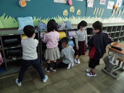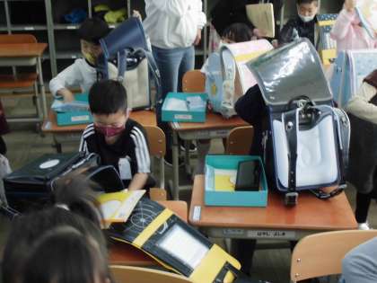 ロッカーにランドセルを片付ける。