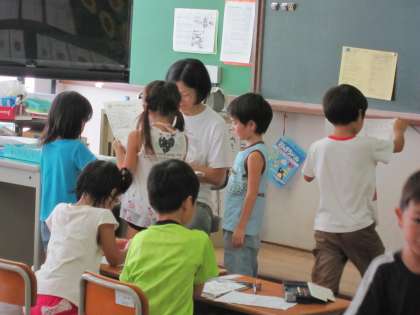 サマースクール2日目。子どもたちは自分のペースでプリントに取り組んでいました。やり終えると自分で答え合わせもしています。学習している姿から入学当初に比べて一段の成長が感じられました。