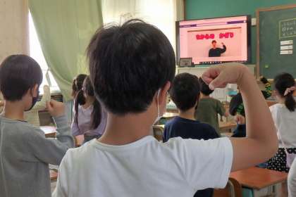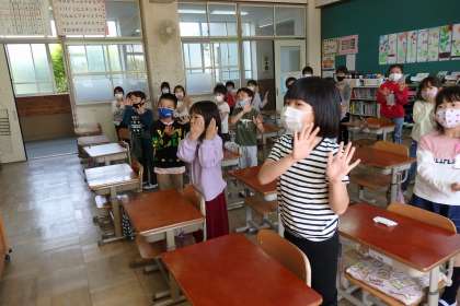 今年度の第一弾は手話で校歌!ダンスのように楽しんで取り組んでいます。福西小学校の校歌に触れられるのもあと一年……と思うと少し寂しい気持ちになります。手話による体の動きを楽しみながら,校歌に親しんでいきたいです。