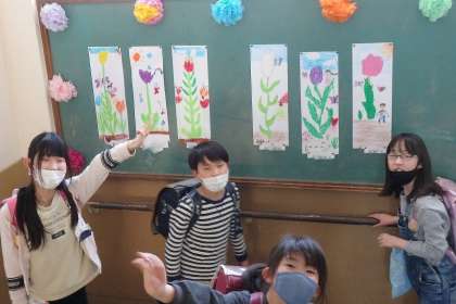 どの学年も,学年が上がって初めての図工の作品ができています。作品は廊下に掲示がしてあり,どの階段もとっても華やかです。
