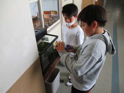昨年度,理科の学習で観察したメダカが,まだ元気に6年廊下で過ごしています。