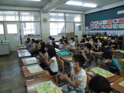 音楽の教科書に載っている「セブンステップス」の曲に合わせて,手やひざをたたいたり,足で床をふみならしたりしました。