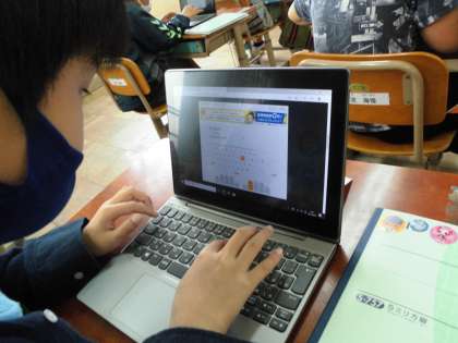 タブレットを使ってタイピングの練習に取り組みました。真剣な表情でひたすらにタブレットに向かいました。