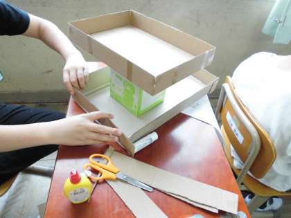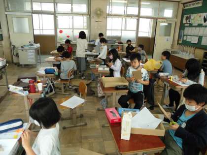 図工の学習でコロコロガーレを作っています。ビー玉を転がすコースを考えながら,自由に制作しています。個性豊かな作品ができそうです。