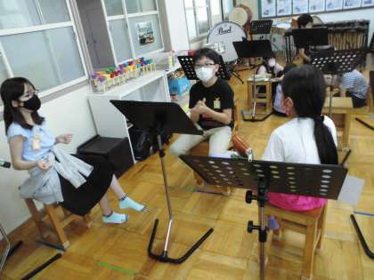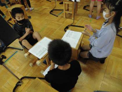 グループでリズムを合わせて,打楽器の合奏をしています。