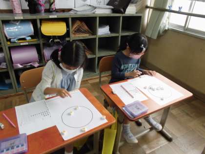 おはじきの代わりにブロックを使って,〇の中にいくつ入って,いくつ入らなかったかを記録しました。