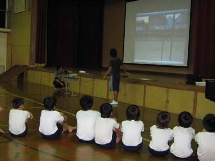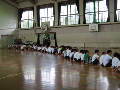 6年生は,小学校生活最後の運動会の最後を「組体操 きずな」で飾ろうと懸命に練習を重ねています。この日も,映像を見ながら自分たちの動作を練習していました。