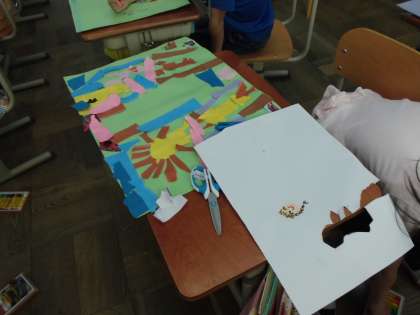 「やぶいたかたちからうまれたよ」の作品にクレパスで絵や人を描きました。