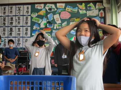 今年度の1年生を迎える会も,コロナ禍の影響で動画交流になりましたが,各学年の出し物に大盛り上がりの5年生でした。写真は3年生のゲーム動画,「落ちた落ちた」の一場面です。楽しそうな様子が伝わりますね。