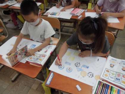 子どもたちは,教科書に載っているプレゼントやかたつむり,アンパンマンやドラえもんを描いたり,形を組み合わせて,家や車,ロボットなども描いたりしていました。