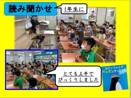 その際に,「1年生にも来てよ!」と1年担任の先生に言われたのがきっかけで,今回の読み聞かせが実現できました。