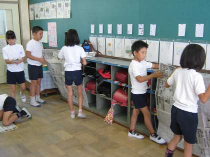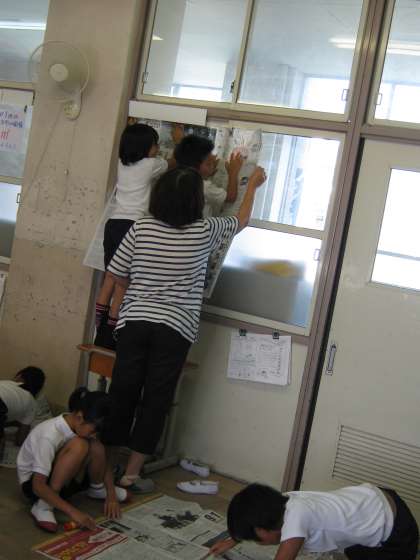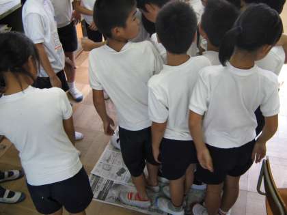 9月8日(木) 4年生は算数で「面積」の学習をしています。この日は,1平方メートルを新聞紙でつくって,教室にあるものと面積比べをしたり何人乗れるか確かめたりしました。