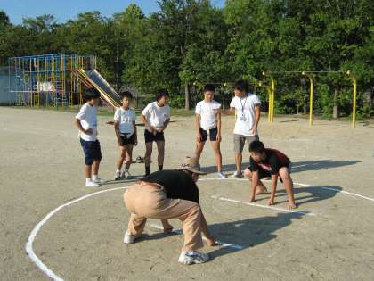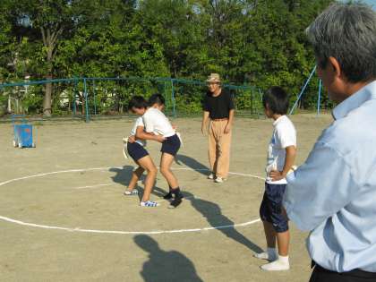 9月11日(日)に行われる「大原野すもう大会」に,6年生代表の子が参加します。この日は,地域の土肥さんにお世話になり,すもうの練習をしました。みんな張り切って練習していました。