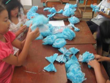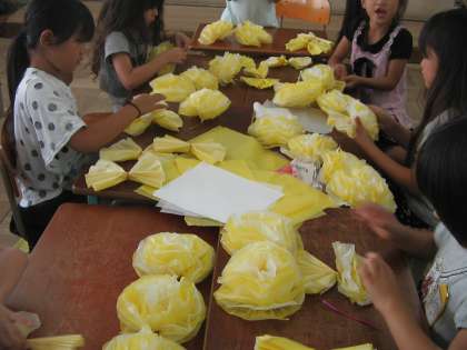 9月9日(金) 2年生は,運動会の団体演技で花笠を使います。この日は花笠用の「お花づくり」をしました。