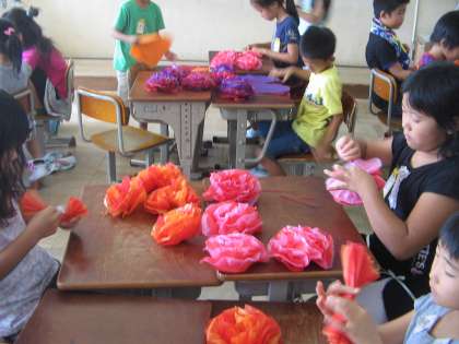ふわふわの紙を折ったりひらいたり・・・みんな悪戦苦闘しやる気が下がっていきましたが,出来上がったきれいなお花にやる気があふれていきました。