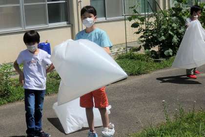 白い袋の中には空気がいっぱい詰まっています。理科で,空気を袋に入れる学習をしている4年生たちです。