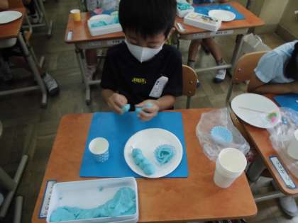 紙コップや紙皿,おかずカップに,クッキーやケーキ,お寿司,ポテト,お肉,パンなどを上手に作って,並べていました。