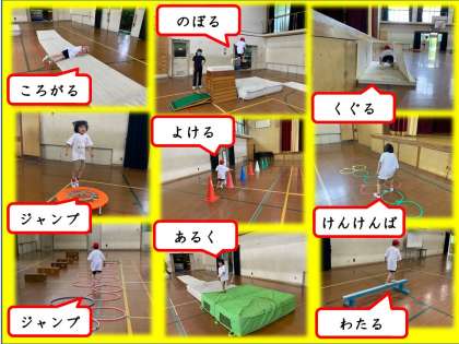 活動の中には,ジャンプしたりくぐったり,のぼったり,よけたり,渡ったりなど体づくりの大切な動きがたくさんあります。
