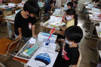 2年生は,本日初めて絵の具を使っての学習をしました。初めてということで,基本の絵の具の使い方や片づけ方を中心に学んでいきました。