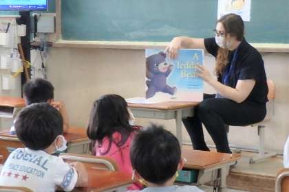 ではなくて,先生が示した体の英語に合わせて,自分の体をさします。今日は体の絵本の読み聞かせをしてもらったり,音楽に合わせて体の部分を抑えるダンスをして,たくさんの英単語を学んでいきました。