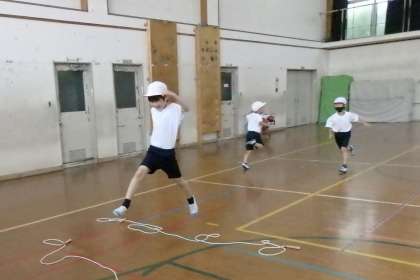 体育科『とびあそび』のようすです。いろいろな跳び方に挑戦していますが,『川とびあそび』は,子どもたちに人気です。助走をつけたり,ひざや踏みきりを意識して,向こう岸まで大きくジャンプを楽しみました。