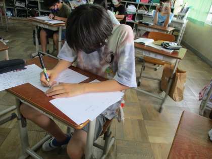 平仮名や画数の少ない漢字はやや小さめに書く。文字の中心を行の中心にそろえ,曲がらないように書く。字間・行間に気を付けて書く。文字と文字,行と行との間の空け方を同じくらいにする等のポイントを大切にしながら書いていました。