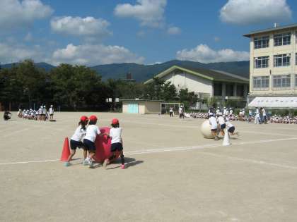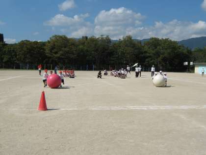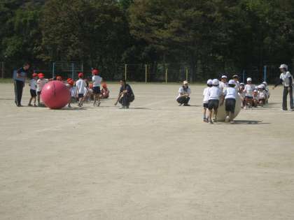 全校練習では,「大玉ころがし」の練習をしました。大玉を下から上へ押すように言っています。子ども達はなれない大玉に苦労しながら一刻も早くゴールしようと頑張っていました。当日はどちらが勝つでしょうか。今から楽しみです。