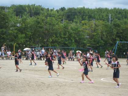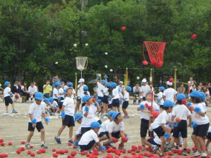 1年団体競技「ねらって なげて シャララララ」かわいい踊りで入場し,赤白球を懸命にかごに入れようとしていました。ねらってもなかなか入らない赤白球でした