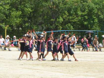 4年団体演技「みんなでスクラム よさポップ!!」では,練習の成果を発揮し,衣装も黒のシャツにピンクのたすきをして,力強くリズムに乗って踊りました。