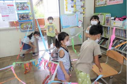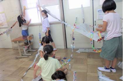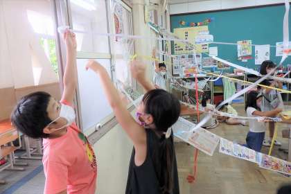 図画工作科『つないでつるして』では,教室中のいろいろな所に紙をつなぎ,デコレーションして遊びました。