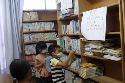 図書館の奥の一角に,『引っ越し待ち』の本のコーナーがあります。図書館の本を整理する中で,古くなった本や2冊以上ある本を,閉校に向けて学級文庫に引っ越ししています。