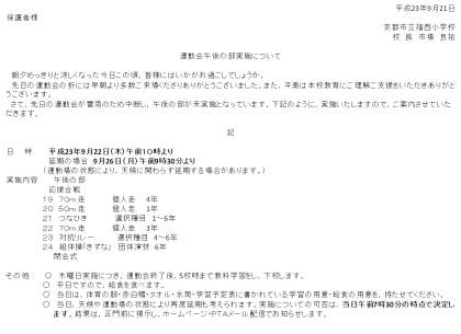 運動会は,9月22日(木)午前10時より実施します。運動場の状況や天候により,再度延期の場合もあります。実施の可否については,9月22日午前7時30分に決定します。