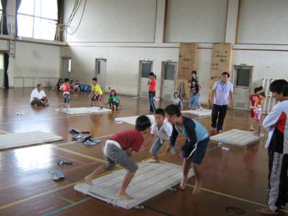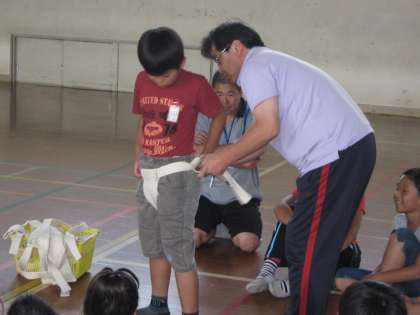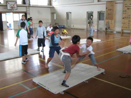 大会では,簡易まわしをつけます。今日は初めてまわしをつけての練習をしました。「はっけよい のこったのこった」と楽しそうに練習していました。