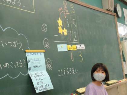 今週から『ひっ算』の学習は,引き算に入ります。「1の位から引く」「上から下に引く」など,1学期の学習で学んだ基本を思い出しながら問題を解いていきました。