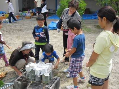 この日は,竹筒でご飯を炊き,自分でつくった竹のお箸で食べました。約50名の子ども達が参加し,更生保護女性会の皆さんと一緒に楽しく活動できました。