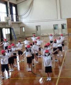 今日の体育は学年全体で,ダンス全体の動きや,順番に手を上げるタイミングを合わせるための練習をしました。何度か繰り返して練習するうちに,どんどん動きがそろっていきます。