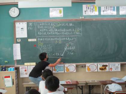 算数科で学習している,「比とその利用」。この日は,ある量をきまった比に分ける方法を考えました。