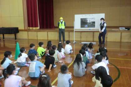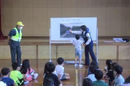 交通安全教室で教えてもらったこと(道路の右側を歩く,右左・前後を確認する,信号が点滅していたら渡らない,止まれの看板では必ず止まるなど)をおうちの人に伝えることです。