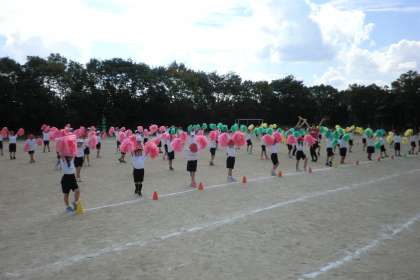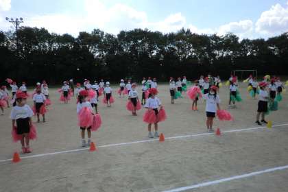 1年生は赤色のポンポン,2年生は緑色と黄色のポンポンを持っているので,運動場で踊るととても華やかでした。