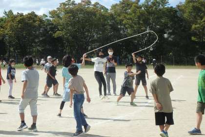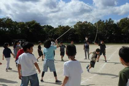 もう片方のクラスは,先生と一緒に大縄跳びの特訓中。タイムも計って,目指せ最高記録♪笑顔いっぱいの休み時間でした。