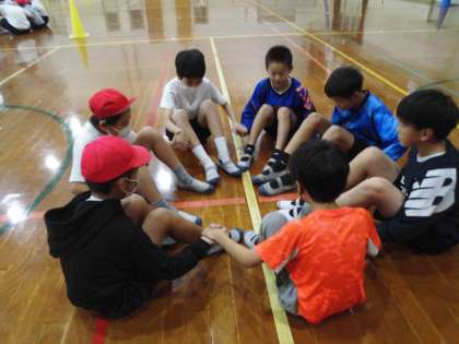 サッカーをする上で大事なことはチームプレー!!友だちと協力して全員で「せーの!」と声を掛け合いながら立ち上がっています。「こうしたらいいんじゃない?」などみんなで声を掛け合いながら,自分のことだけでなく相手のことも考えて動く姿が見られました。