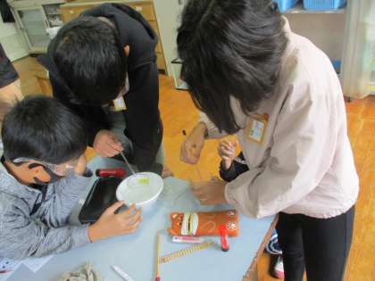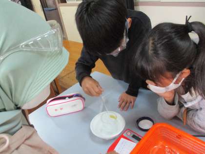 理科の学習では,「「ものの溶ける量を増やすにはどうすればよいのだろうか。」という学習問題を設定し,実験を行いました。自分で予想し,どのような結果になるのか見通しを立てながら実験を行っています。