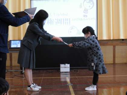 朝会の前に,図画工作の作品展やアイデア展の表彰がありました。
